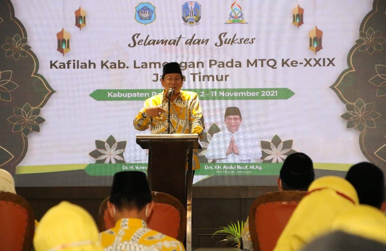 Lamongan, kabar1news.com – Sejumlah 55 orang kafilah asal Kabupaten Lamongan yang akan turun di ajang MTQ ke XXIX Tingkat Provinsi Jawa Timur yang dilaksanakan sejak tanggal 2 hingga 11 November mendatang di Pamekasan secara langsung diberangkatkan dari Pendopo Lokatantra oleh Wakil Bupati Abdul Rouf, Senin (1/11).