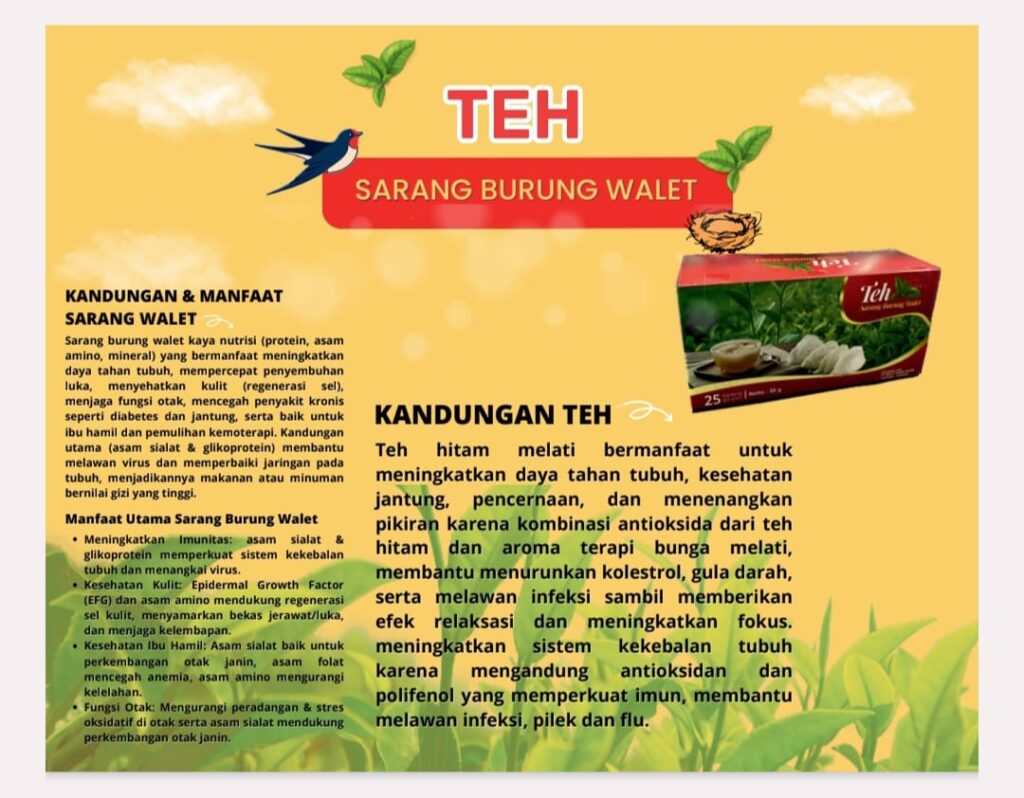“Teh sarang burung walet merupakan pilihan minuman herbal yang tidak hanya menyegarkan, tetapi juga kaya manfaat kesehatan. Untuk pemesanan langsung bisa melalui no hp : 081 334 324 541. Meski demikian, konsumsi sebaiknya dilakukan secara bijak dan diimbangi dengan pola hidup sehat,” pungkasnya.(F2/Red)