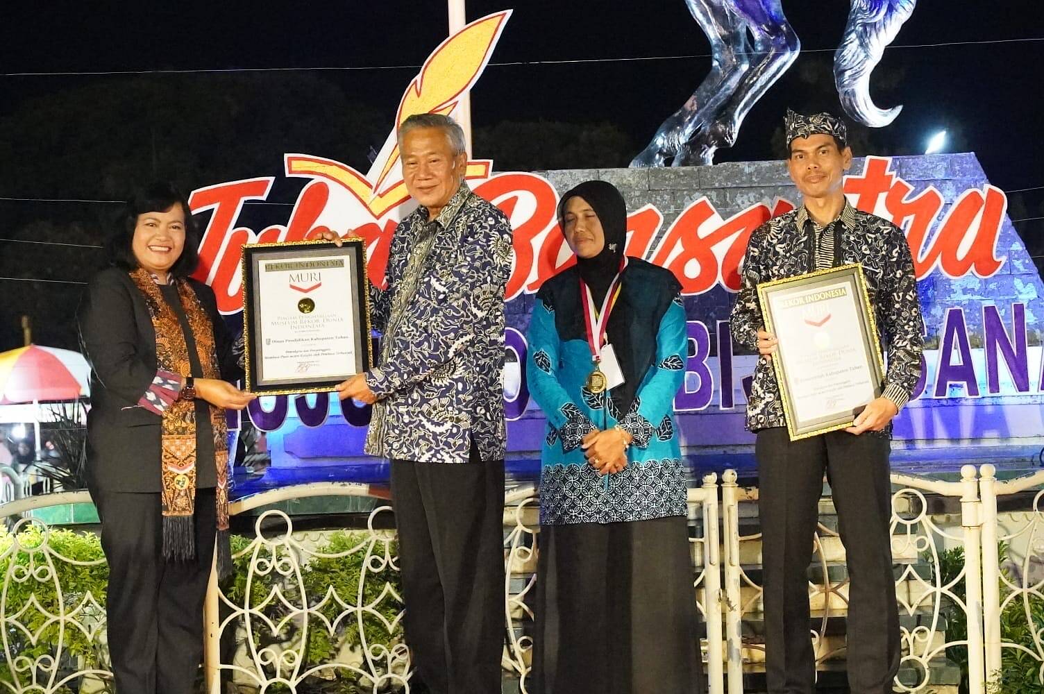 TUBAN, Kabar1News.com – Kabupaten Tuban kembali mencatatkan prestasi dengan pemecahan rekor dari Musium Rekor Dunia Indonesia (MURI) yang diserahkan Jumat malam (9/12) di area bawah patung kuda Alun-alun Tuban.
