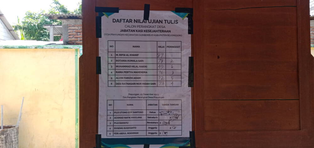 Bojonegoro, Kabar1news.com – Panitia Penjaringan Calon Perangkat Desa Prayungan Kecamatan Sumberrejo Kabupaten Bojonegoro Provinsi Jawa Timur menggelar ujian calon Perangkat Desa (Perades) di ruang kantor desa setempat, Rabu (20/12/2023) pagi.