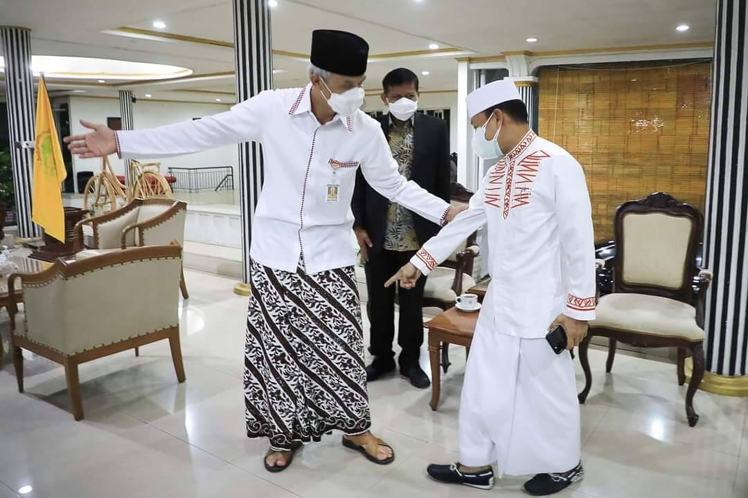 SEMARANG, kabar1news.com – Sarung batik yang dikenakan Gubernur Jawa Tengah Ganjar Pranowo menarik perhatian Ustaz Das’ad Latif saat bersilaturahim di Rumah Dinas Puri Gedeh, Jumat (22/10/2021). Ustaz asal Sulawesi Selatan itu memuji sarung yang diproduksi santri dari Solo tersebut.