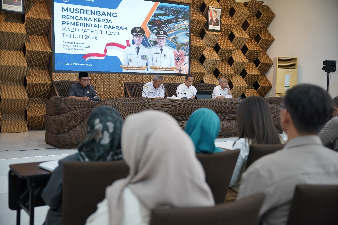 TUBAN, Kabar1News.com – Wakil Bupati Tuban, Drs. Joko Sarwono memimpin Musyawarah Perencanaan Pembangunan (Musrenbang) Rencana Kerja Pemerintah Daerah (RKPD) Kabupaten Tuban tahun 2026, Rabu (26/03/2025). Bertempat di Gedung KORPRI Kabupaten Tuban, kegiatan ini merupakan agenda tahun yang diselenggarakan Badan Perencanaan Pembangunan, Riset dan Inovasi Daerah (Bapperida) Kabupaten Tuban.