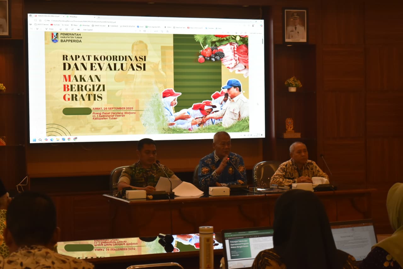 Wakil Bupati Tuban, Drs. Joko Sarwono didampingi Dandim 0811/Tuban Letkol Inf Dicky Purwanto dan Sekretaris Daerah Kabupaten Tuban, Dr. Ir. Budi Wiyana, M.Si., memimpin Rapat Koordinasi dan Evaluasi Program Makan Bergizi Gratis (MBG), Jumat (26/09/2025). Berlokasi di ruang Dandang Wacana Setda Tuban, rakor dan evaluasi program MBG perdana ini dihadiri Satgas MBG Tuban, pimpinan Organisasi Perangkat Daerah (OPD), para camat, serta perwakilan 45 Satuan Pelayanan Pemenuhan Gizi (SPPG) se-Kabupaten Tuban.